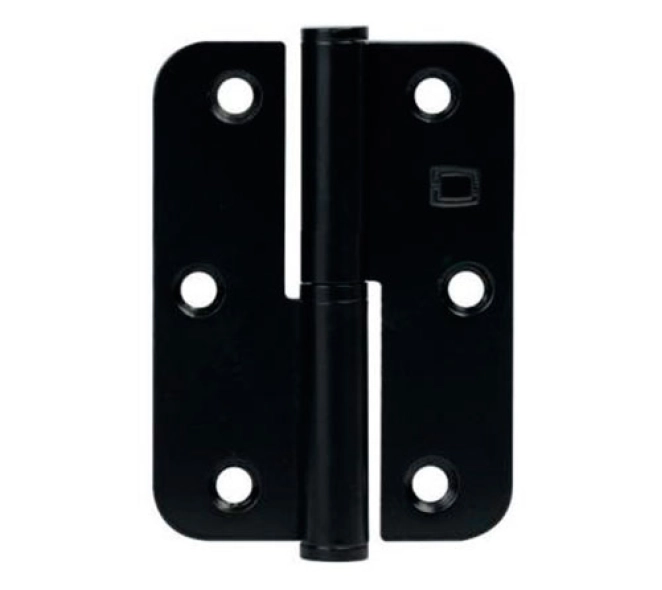 Pern model 112 esquerra per a portes de pas residencials i d'ús públic. Fabricat amb acer inoxidable d'acabat negre i suporta un pes màxim de 100 quilos amb 4 frontisses.