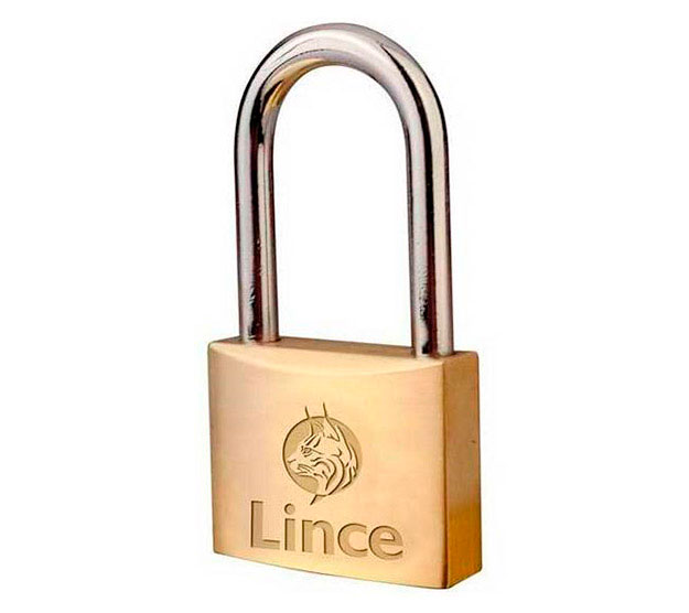 Candado largo estándar Lince serie tradicional 300 con cuerpo de latón pulido con agujero de drenaje y arco de acero al carbono cementado.