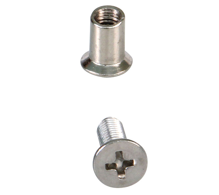 Tornillo en acero inoxidable 18/8 y casquillo en latón cromado para la fijación de los herrajes en sistemas de cabinas sanitarias.